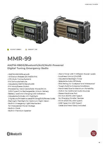 • AUX-In for Additional Audio Sources • Powered by Hand Crank/Solar Power/DC-In • Hand-Held Size for Maximum Portability