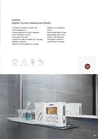 • Water-Resistant 2-Watt Speaker • Adjustable Sleep Timer